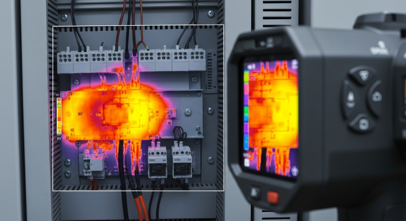 La termografía usa una cámara de infrarrojos para medir la temperatura de los componentes eléctricos en funcionamiento, sin necesidad de tocarlos. Permite detectar puntos calientes en conexiones y disyuntores que serían imposibles de encontrar visualmente. Es especialmente útil en tableros de locales comerciales o instalaciones con alta carga.